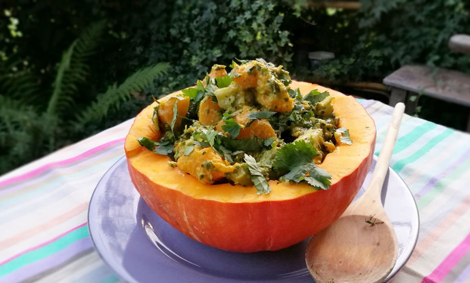 Добавить чайную ложку растительного масла и все растереть. Смесь нагревать 10-15 секунд в микроволновке, пока не проявится запах специй. В стакан налить 100 мл кокосового молока. В молоко добавить разогретую смесь специй и размешать. Овощи посолить, залить кокосовым молоком со специями и перемешать. Поставить в духовку на 40 минут. В процессе тушения овощи ещё пару раз перемешать. Приблизительно за 10 минут до готовности добавить порезанный шпинат.  Я добавляла замороженный. Когда тыква станет мягкой овощи вынуть из духовки, посыпать свежепорезанной зеленью кинзы. Подавать остывшими или тёплыми.