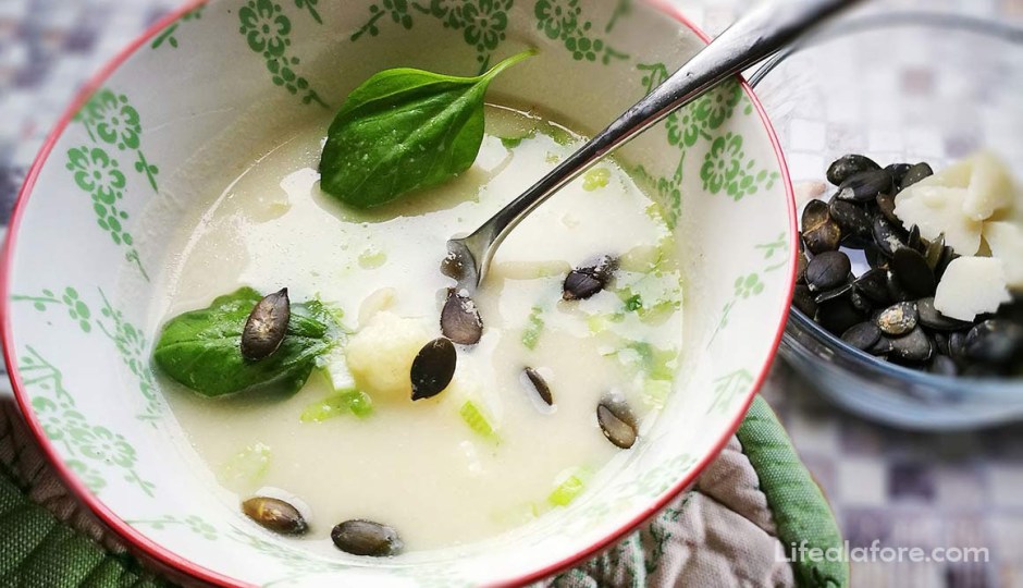 После 10- минутной варки капусту в супе измельчаем с помощью миксера в пюре, добавляем тертый пармезан, перемешиваем, чтобы сыр расплавился в горячем супе. Разогреваем в супе оставшиеся целыми соцветия капусты. Солим, перчим, посыпаем мускатным орехом. На сковородке без жира поджариваем тыквенные семечки. Мелко режем зелень лука. Моем листики базилика.