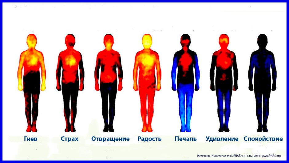 stress3Человек эмоционально реагирует на происходящее с ним, а эмоции вызывают изменения в теле.  Финские психологи построили карту телесных реакций на определенные эмоции. У людей, которые участвовали в эксперименте, с помощью слов, историй, видео вызывали одну из основных эмоций — гнев, страх, отвращение, радость, печаль, удивление. Каждый из участников закрашивал на картинке с силуэтом спокойного человека (черном) те места, где в ходе эксперимента он чувствовал повышенное напряжение, прилив энергии (от красного до желтого по нарастающей). Там, где, наоборот,  тонус понижался-цветами от синего до голубого. Оказалось, что у разных людей ощущения практически совпадают. Гнев воздействует на голову и грудь, удивление более всего связано с областью глаз. Страх охватывает грудь и живот.