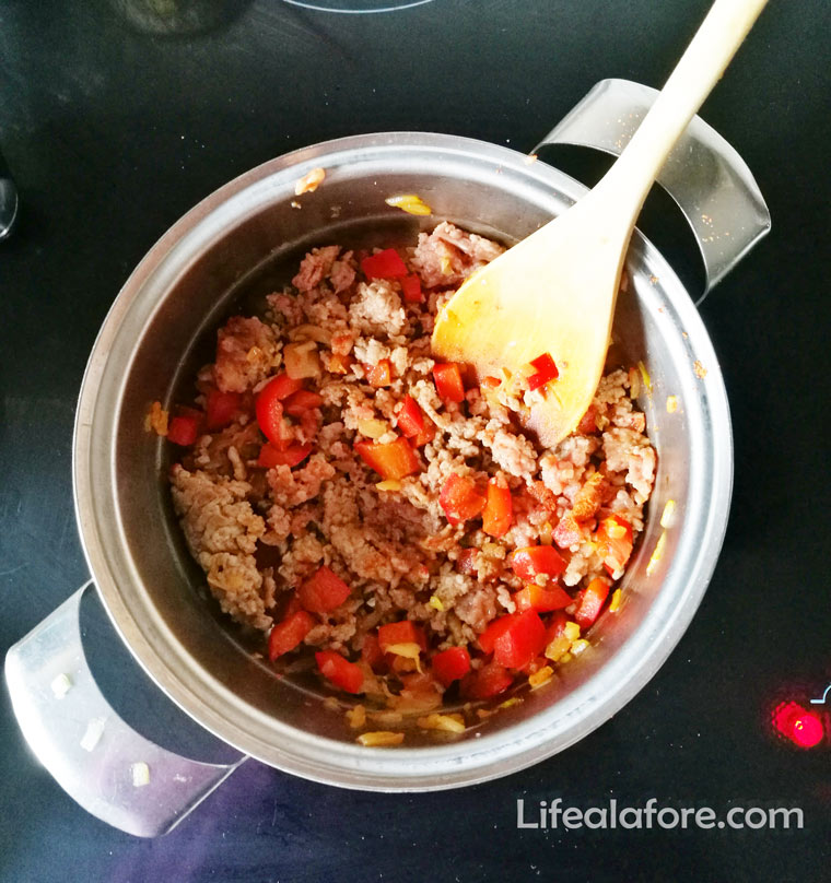 - Увеличить нагрев. Положить в кастрюлю фарш и размять его лопаткой. Постоянно перемешивая тушить мясо до тех пор, пока оно перестанет быть розовым.