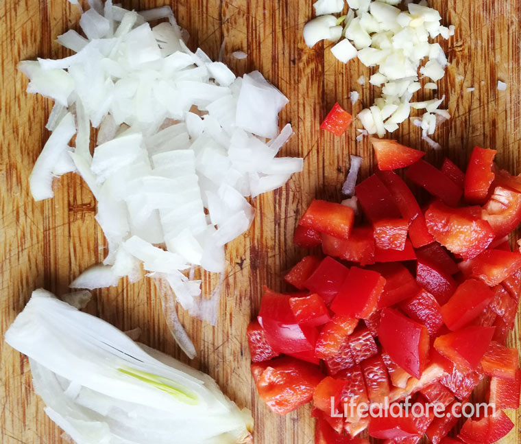 - Перец разрезать вдоль, вычистить семена. Половинки перца порезать на кусочки.