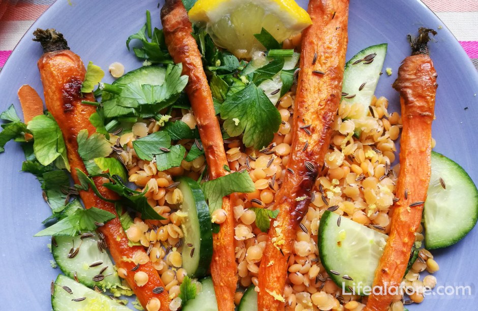 - Чечевицу, огурцы и зелень выложить на тарелку. Сверху поместить морковь. Полить заправкой.