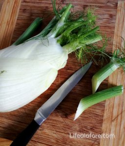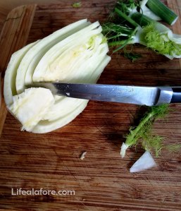 Перед тем, как привести сегодняшний рецепт, расскажу о том, как фенхель выбрать и подготовить. Клубни должны быть плотными, белыми, а стебли зелеными. Срез у основания не слишком темный. Фенхель нужно тщательно вымыть, так как между листьями может быть песок. Затем обрезать основание клубня и стебли, а клубень разрезать пополам.