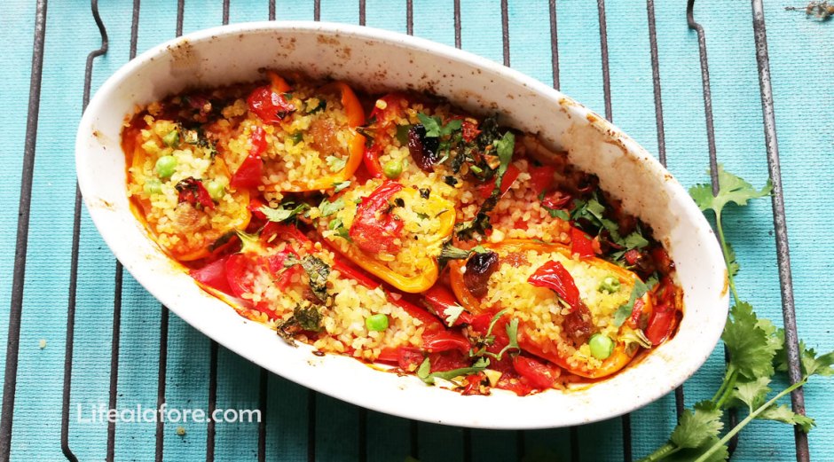 Яркое, аппетитное и очень полезное блюдо из разноцветных перцев — отличная еда не только для взрослых, но и для детей. Изюм и восточные специи с корицей и имбирем придают начинке из булгура приятный сладковатый вкус. Может для детей и не совсем привычный, но попробовать стоит! Как раз для того, чтобы попробовать хотелось, я сделала это блюдо не из обычных перцев, а и маленьких сладких перчиков. Каждый перчик — «на один зуб», а по вкусу не отличаются от больших. А еще в них почти нет семян.