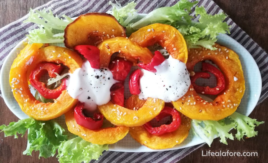 Салат или гарнир к индейке для любителей тыквы и перца. Почему полезно? Во-первых, это сезонные овощи и они сейчас в наилучшей форме. Во-вторых, этот салат — витаминная бомба: очень много бета-каротина, витамина С и других важных витаминов. И еще минералы и балластные вещества. Кстати, больше всего витамина С именно в красном сладком перце. Когда перец запекается в духовке, количество витамина С в нем уменьшается, но ненамного.
