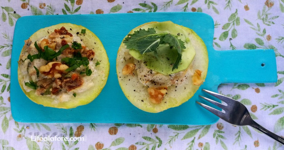 - Разогреть духовку до 180 градусов. Кольраби вымыть, почистить и разрезать каждый кочанчик поперек на 2 части. Из половинок кольраби чайной ложкой вынуть середину, оставив стенки толщиной 1 см.