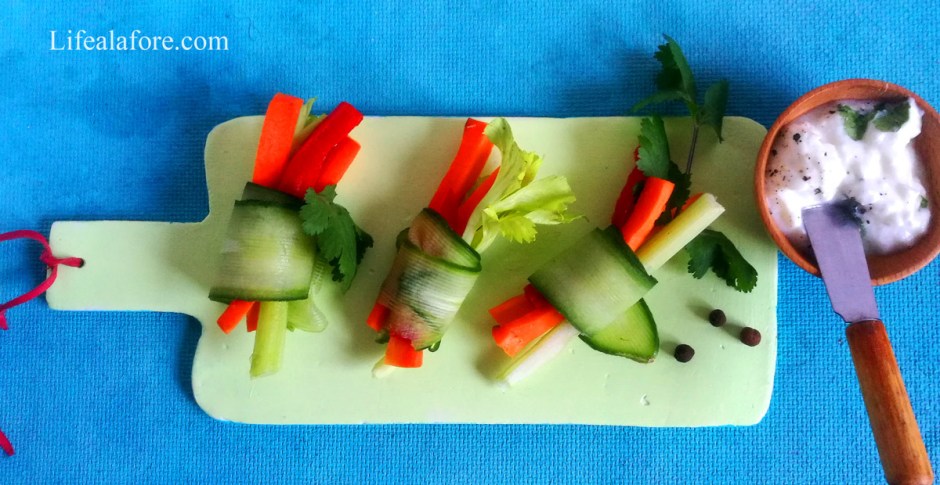 Сезонные овощи, то есть те, что сохранили еще какие-то витамины и зимой, мы едим больше вареными, тушеными или еще как-нибудь приготовленными. Как быть с сырыми овощами? Салат из капусты порезать, морковку погрызть, а можно еще на скорую руку перекусить такими овощными рулетиками, макая их в острый йогуртовый соус цацики с пряным вкусом зелени и чеснока. Я бы добавила этот рецепт в книгу «Возьми с собой», потому что рулетиком можно перекусить и на работе.
