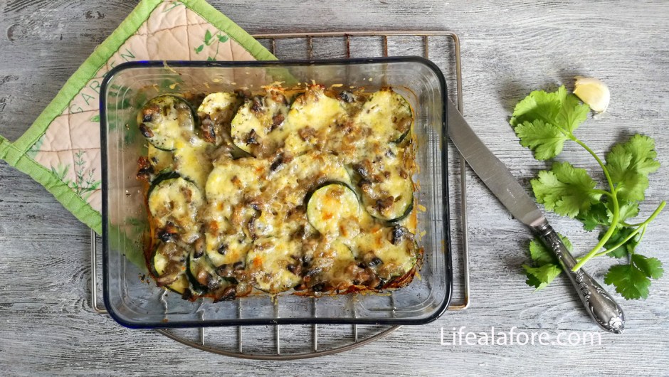 - Лук с грибами равномерно распределить поверх кабачков.