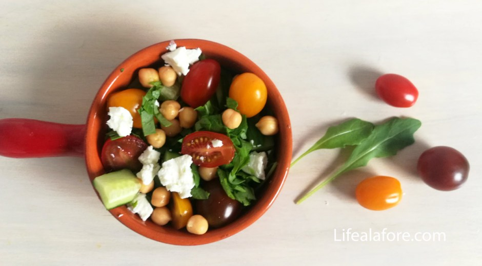 - Нут переложить в сито, воду слить, облить холодной водой и переложить в миску с салатом.