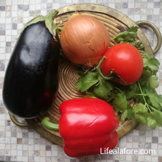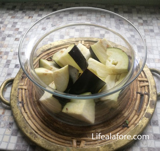 - Овощи и зелень вымыть, почистить лук. Баклажан разрезать на крупные куски, сложить в посуду для микроволновки, прикрыть крышкой и поставить готовиться на 6-8 минут. Время приготовления зависит от размера и количества баклажанов, мощности микроволновки. Баклажаны можно также положить в микроволновку целиком, завернув в пищевую пленку.