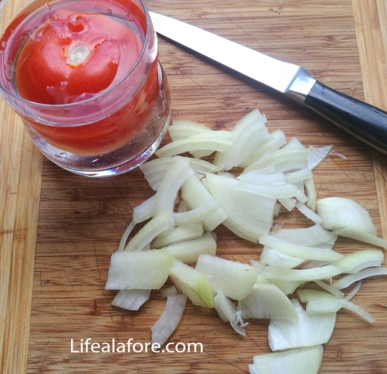 - Помидоры сложить в глубокую мисочку и залить кипятком так, чтобы вода покрывала их целиком. Нарезать лук.