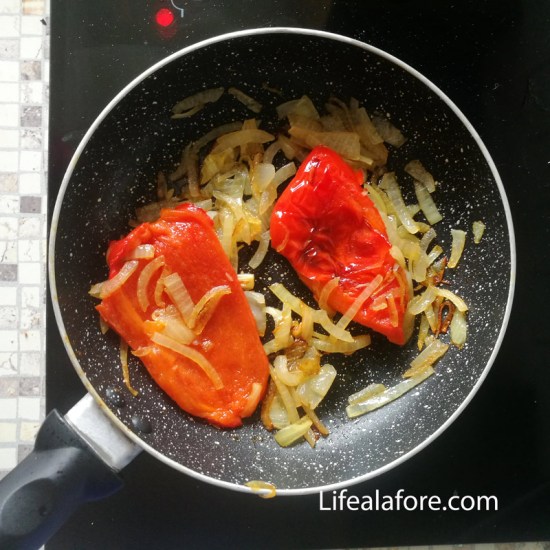 - Пока готовятся баклажаны в сковороде с небольшим количеством рафинированного масла поставить тушить лук . Перец разрезать на 2-3 части и добавить к луку, шкуркой вниз. В лук с перцем положить семечки. Тушить, пока лук не станет золотистого цвета, а перец мягким.
