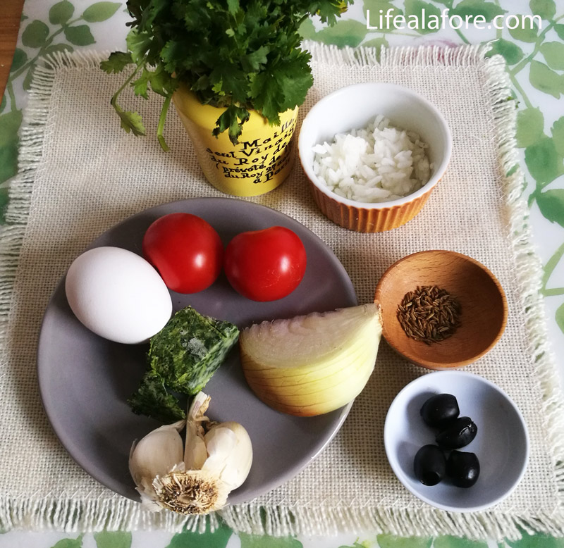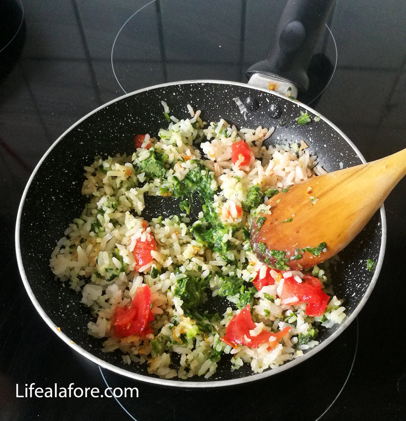 - 2 томата очистить от шкурки и мелко нарезать. Выложить в сковороду с луком нарезанные листья свежего шпината или кубик замороженного, томаты. Потушить вместе с луком 5 минут, перемешивая. Добавить в сковороду рис, посолить, посыпать тмином, перемешать.