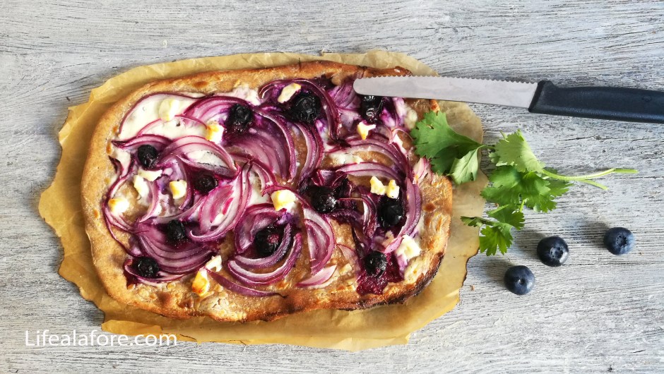 Этот пирог родом из Эльзаса, только в оригинале его пекут с луком и кубиками сала. А мы можем заменить сало кусочками острого сыра фета и сочной черникой. Так даже интересней. Главное в этом пироге — очень тонкое хрустящее тесто и сметана, на которую выкладывают разнообразную начинку.