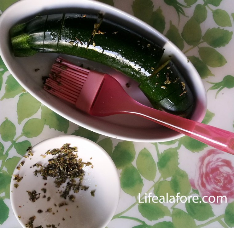 2. В мисочке смешать масло, тертый чеснок, тимьян, соль и перец. Количество соли и перца по вкусу. Выложить цуккини в форму, смазанную маслом, или на лист. Немного раздвинуть ломтики и смазать овощи сверху маслом с травой.