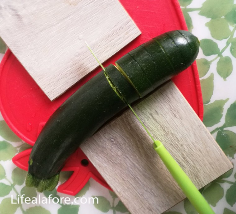 - Цуккини вымыть. Каждый из них нарезать поперек на расстоянии около 1 см, но овощи до конца не прорезать. У них должно остаться общее основание. Чтобы это было проще сделать, можно положить по обе стороны от цуккини деревянные брусочки одинаковой толщины, чтобы нож не мог пройти насквозь. Я использовала 2 деревянные подставки (примерно 1 см толщиной).