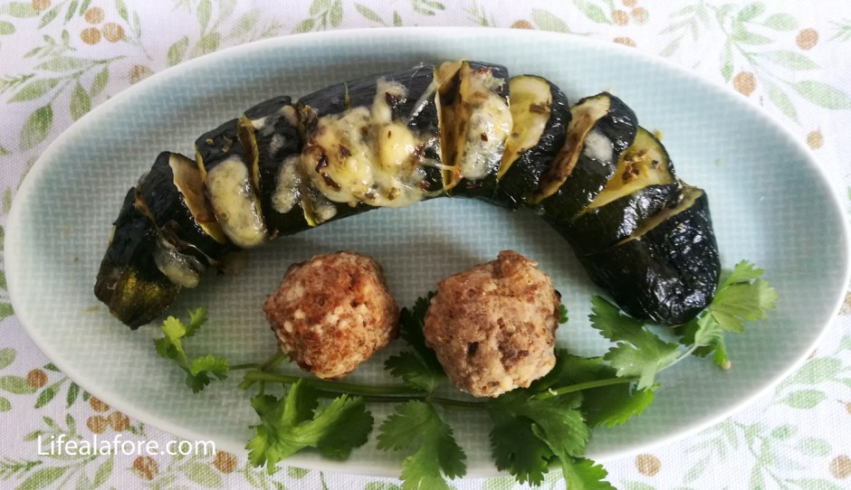 Обычно готовят картофель Hasselback — запеченный в духовке картофель, нарезанный особым образом. Это блюдо было придумано шведским поваром, потому и называется так загадочно. Попроще его называют картошка-гармошка, потому что смысл как раз в нарезке картофеля тонкими ломтями. Тогда края ломтиков становятся хрустящими, а середина остается мягкой. Мы запечем вместо картофеля цуккини, нарезанные гармошкой. Хрустящими они не станут, но зато не будут слишком водянистыми и насквозь пропитаются специями и вкусом печеного сыра. Так приготовленные овощи — отличный гарнир к мясу, например, к фрикаделькам из постной говядины.