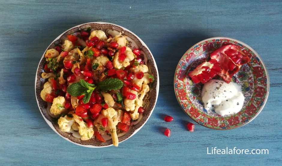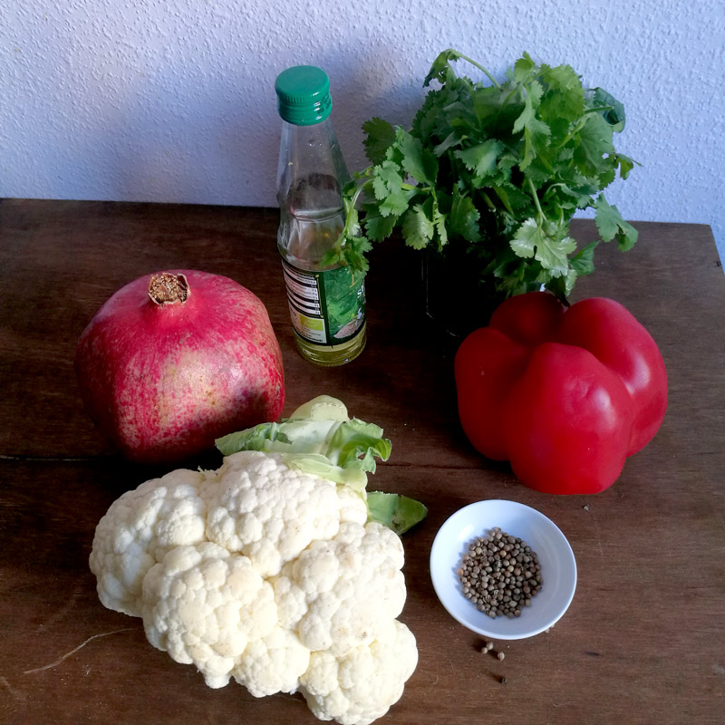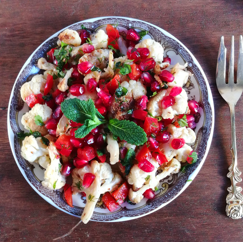 Сочетание нашей обычной цветной капусты с кисло-сладкими зернами граната- культового плода на Востоке, символом плодородия и целебной силы, может показаться странным, но это только на первый взгляд. Ведь гранат и капуста в некотором роде родственники. Цветную капусту выращивали в Сирии еще 2000 лет назад, а затем, гораздо позже, завезли в Испанию. Поэтому ее раньше даже называли сирийской. Так что этот рецепт относится к традиционной восточной кухне.