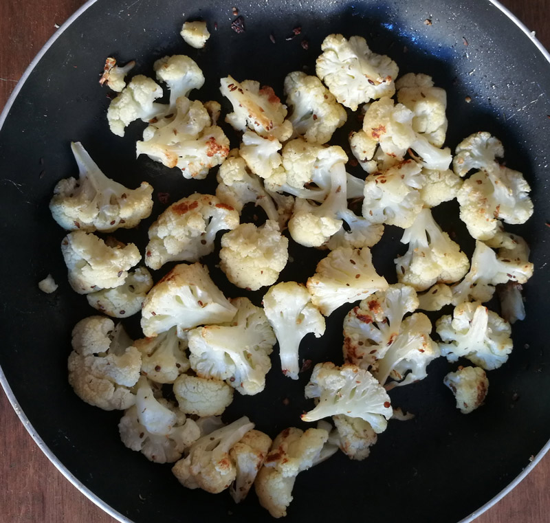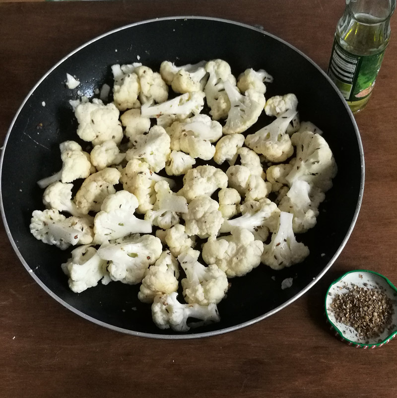 Духовку разогреть до 200°. Цветную капусту вымыть, разделить на соцветия и дать им обсохнуть. Вымыть зелень и перец. Семена тмина и кориандра растолочь в ступке. Капусту выложить на лист для запекания, посыпать подготовленными семенами, сбрызнуть маслом и посолить. Аккуратно перемешать розетки капусты, чтобы они были равномерно смазаны маслом и специями. Капуста должна лежать на листе в один слой.