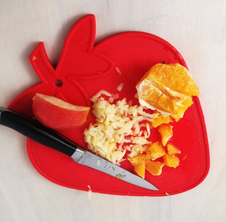 Апельсин почистить, разделить на дольки, каждую дольку нарезать на кусочки. Яблоко почистить, разрезать на 4 части и натереть на крупной терке.