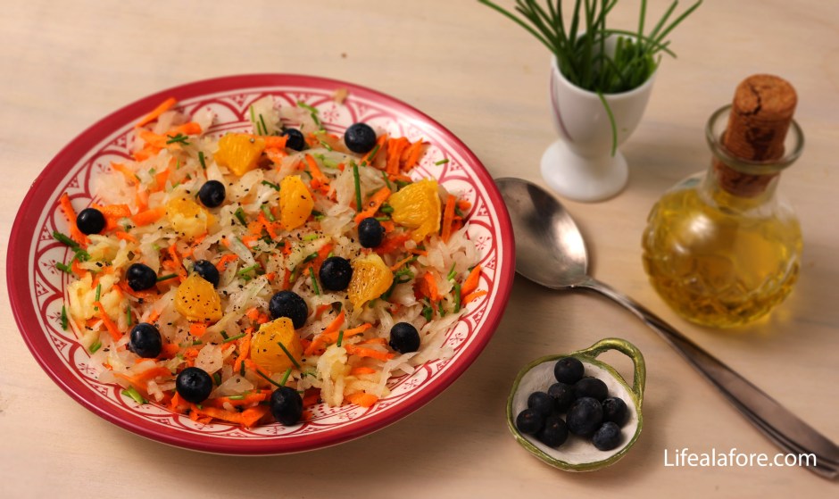*** Я сделала этот салат с маслом кунжута и свежей черникой. Можно положить немного клюквы или малины, а вместо апельсинов, например, кусочки ананаса.