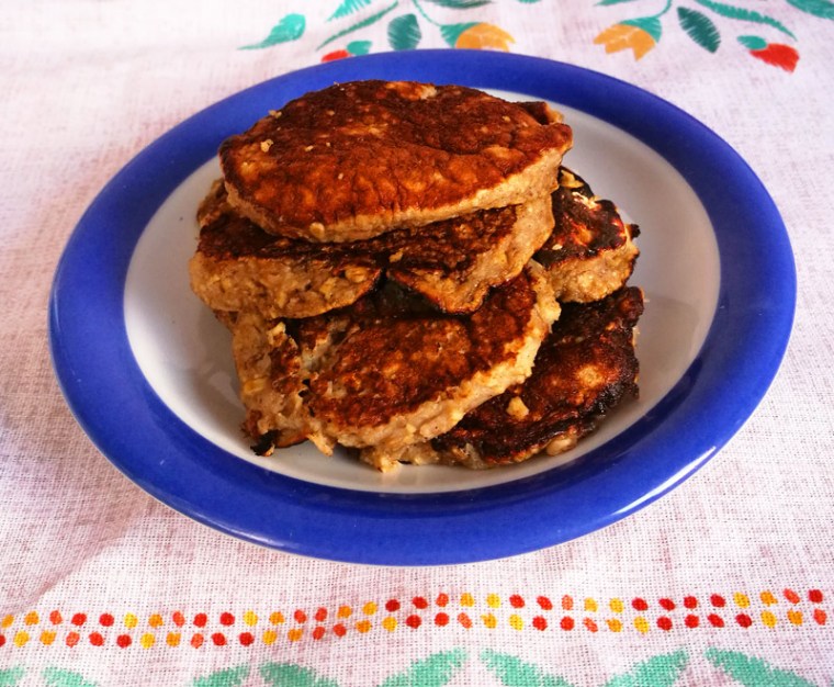 Смесь перелить в миску, добавить в нее овсяные хлопья и хорошо перемешать. Отставить тесто на несколько минут. Разогреть сковороду, смазать ее маслом, столовой ложкой вылить блинчики в сковороду. Выпекать при небольшом нагреве под крышкой 2-4 минуты, пока низ не подпечется. Перевернуть и запечь до готовности.