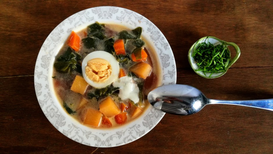 Листья свежего шпината вымыть и откинуть на дуршлаг. Лук порей разрезать вдоль и хорошо промыть. Морковь, петрушку и картофель вымыть, очистить. Картофель и морковь и нарезать кубиками. Овощи положить в кастрюлю, добавить сметану, подлить немного воды и тушить при небольшом нагреве 5 минут. Я кладу порей обычно целым куском и вынимаю из готового супа. Если вам нравится вареный лук, нарежьте стебель лука поперек тонкими ломтиками.