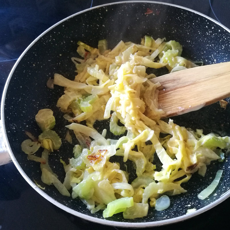 В сковороде разогреть масло, добавить лук и потушить его 1-2 минуты, перемешивая. Переложить в сковороду капусту и сельдерей и все вместе тушить при небольшом нагреве 8-10 минут, пока капуста не станет мягкой. Время от времени подливать понемногу воду.