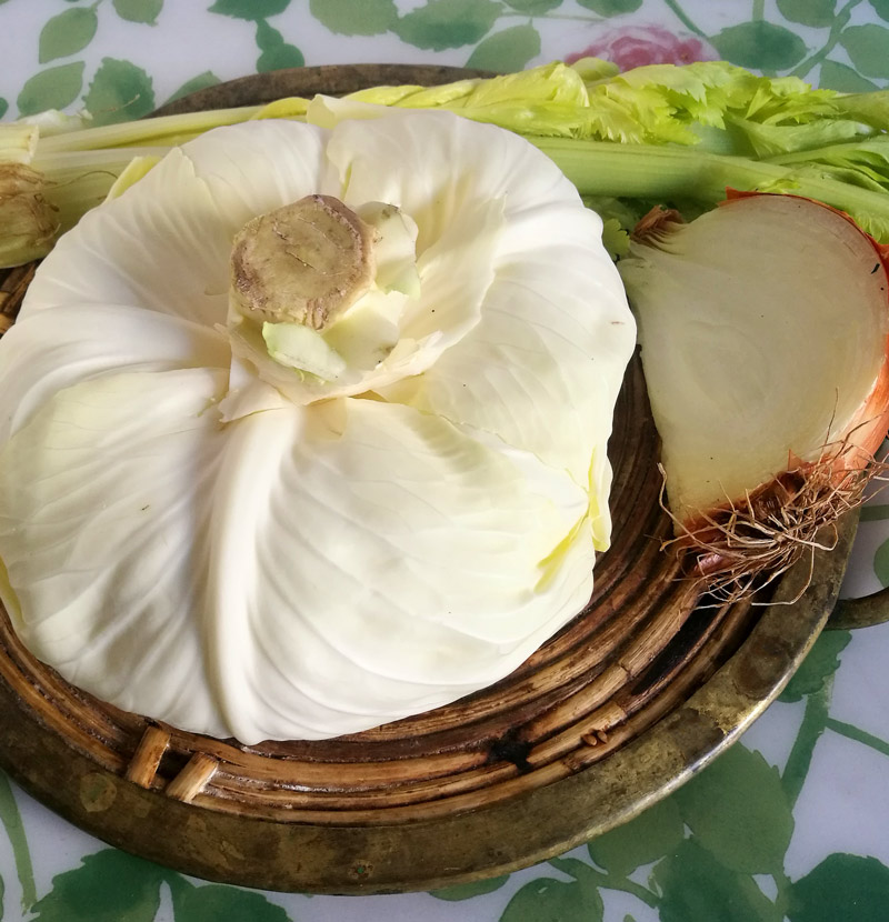 Капусту вымыть, вырезать кочерыжку, листья нашинковать. Стебли сельдерея отрезать от основания, с другого конца обрезать зелень. Стебли вымыть и удалить жесткие нитевидные волокна. Для этого погрузить нож на 1 мм в мякоть сельдерея, подцепить нить и потянуть за нее, пропуская между пальцем и ножом. Очищенный стебель нарезать поперек тонкими ломтиками. Почистить лук, разрезать его пополам и нарезать полукольцами. Укроп вымыть, обсушить и покрошить.