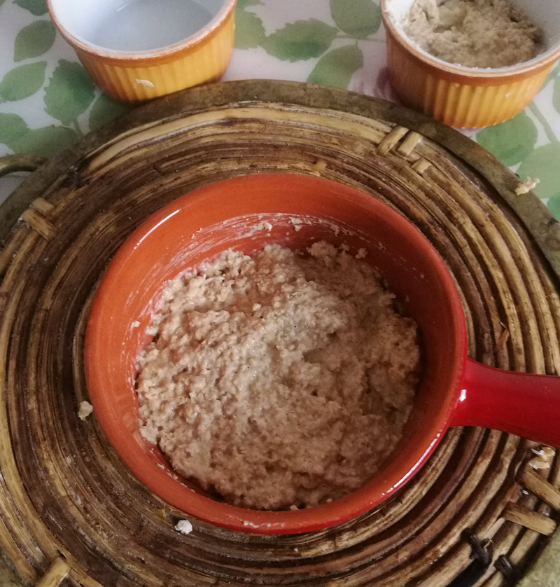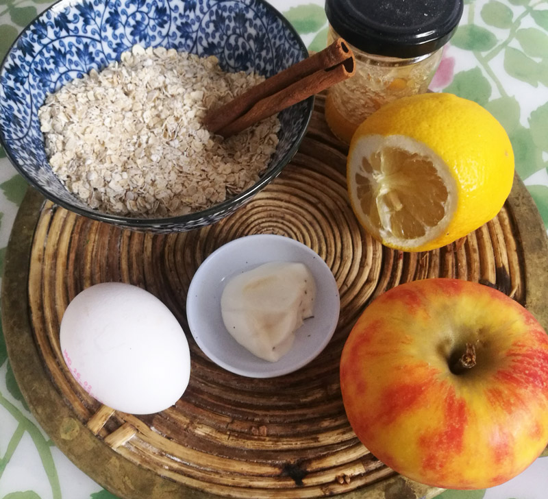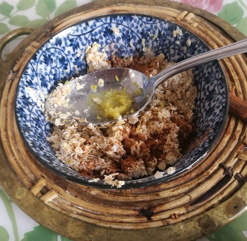 В миске смешать овсяные хлопья с корицей. В другой миске разболтать вилкой яйца, добавить сметану, лимонный сок и цедру. Перемешать. Влить яичную смесь в овсяные хлопья. Аккуратно перемешать.