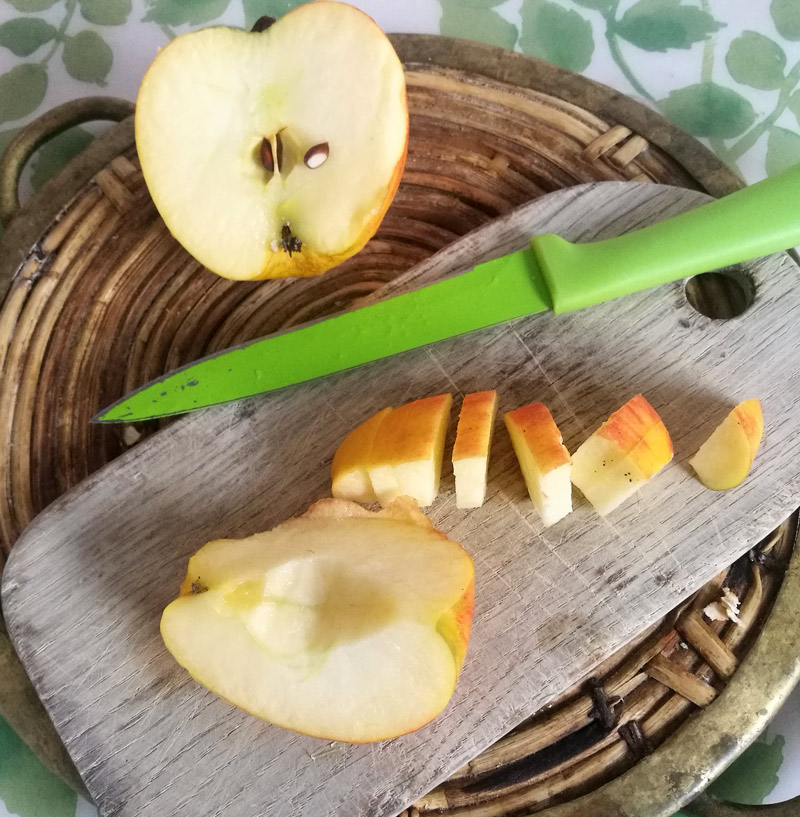 Яблоки вымыть, разрезать на четвертинки, вырезать из них серединки и нарезать поперек ломтиками.