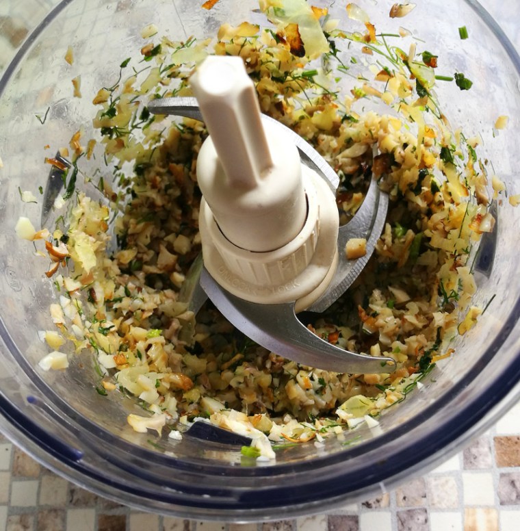Грибы с луком размолоть в блендере до мелких кусочков. Готовую начинку посолить и поперчить по вкусу.