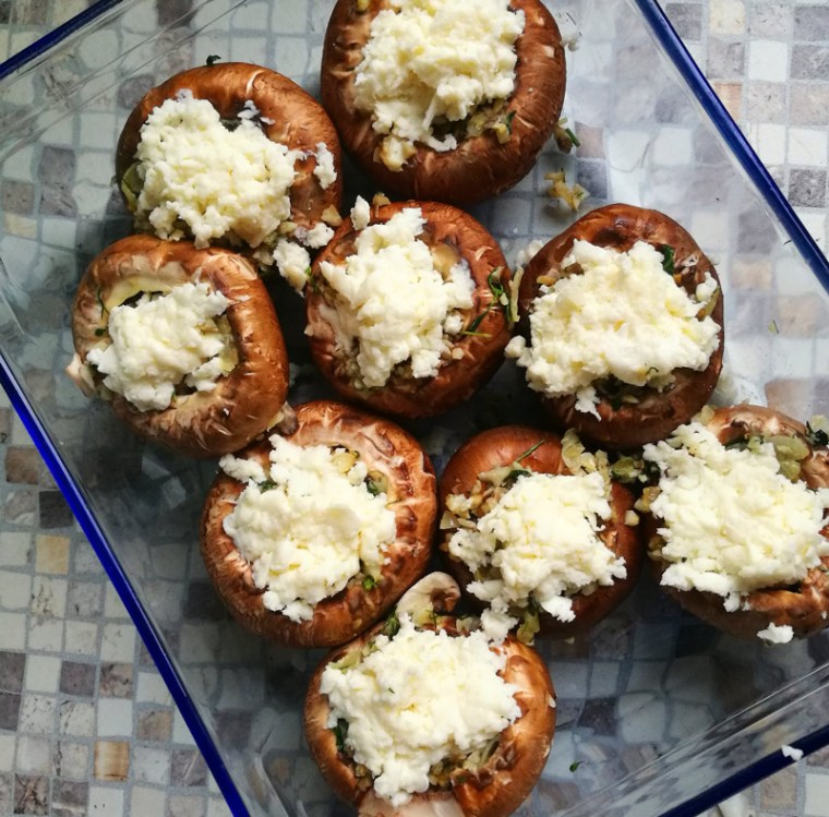 Натереть моцареллу на терке. Грибные шляпки слегка посолить внутри, распределить в них начинку, утрамбовать ее, а поверх начинки выложить моцареллу.
