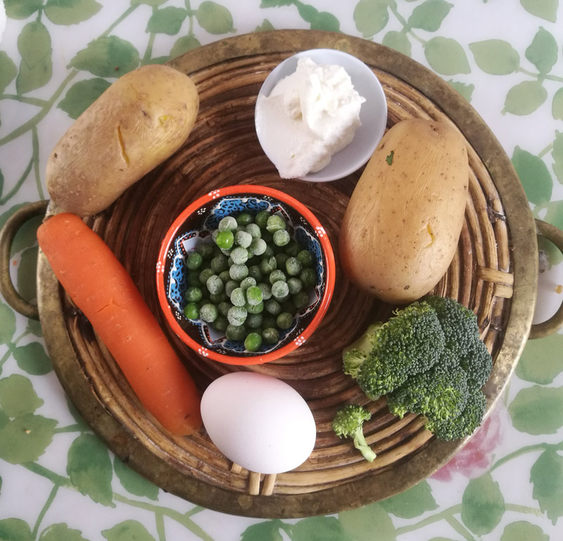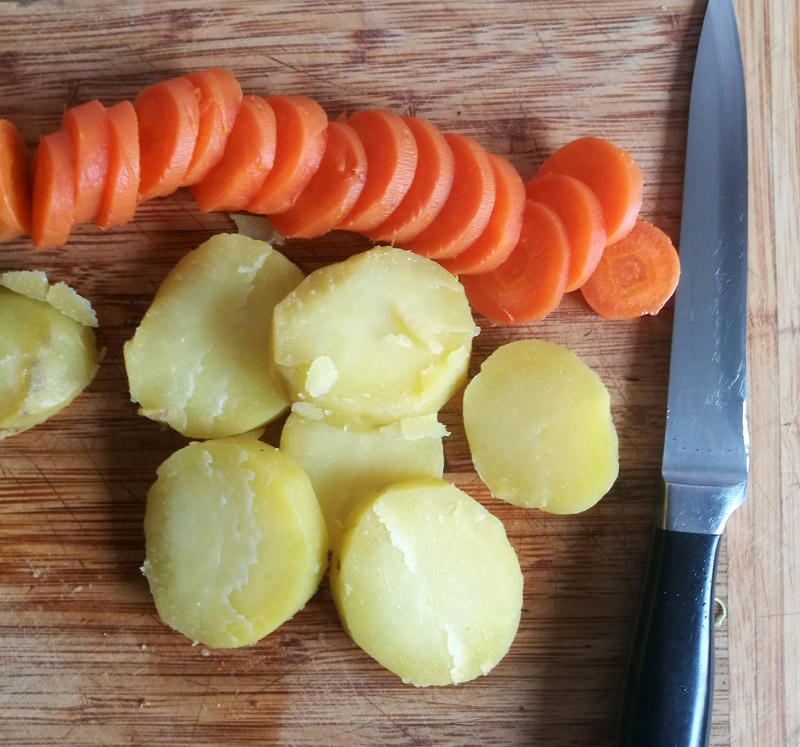 Разогреть духовку до 200°. Разобрать брокколи на маленькие розетки, положить в мисочку и залить кипятком, подождать 1 минуту и слить с них воду. Картофель и морковь почистить и нарезать поперек кружочками.