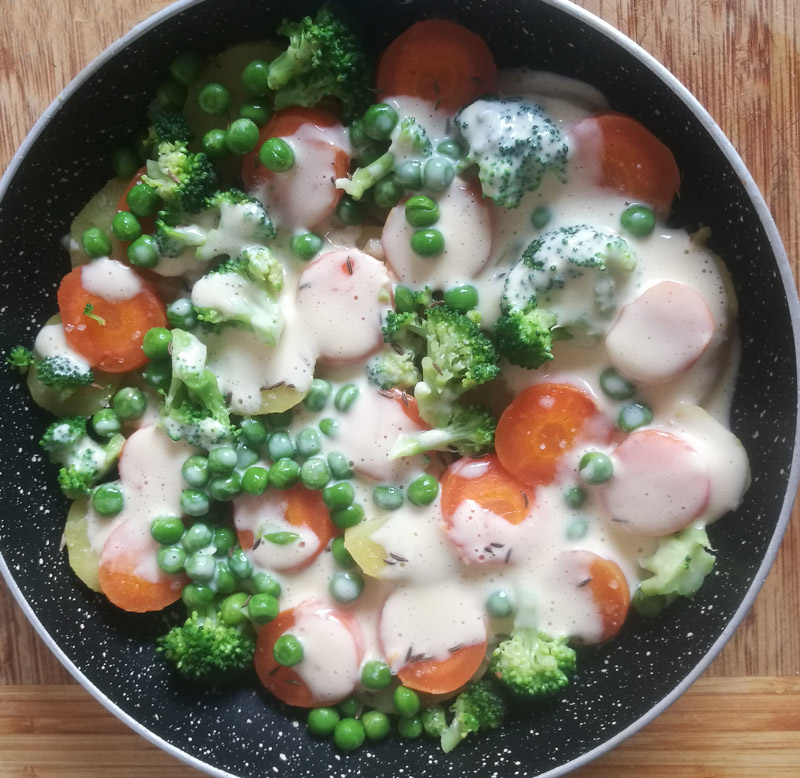 Жаропрочную сковороду или форму смазать маслом и выложить дно ломтиками картофеля. Наверх плотным слоем выложить кружочки моркови, розетки брокколи и зеленый горошек. Посолить.
