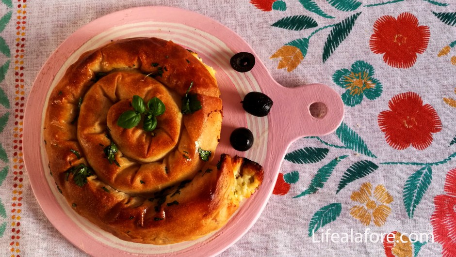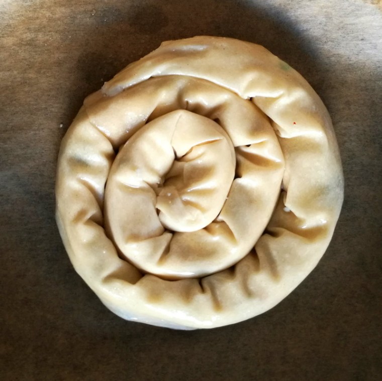 Это пирог очень быстро печется из готового теста фило. Оно такое тонкое, что пирог есть, а теста в нем почти нет. На одну улитку расходуется 50 г теста, в котором всего 3 г жира и 3 г сахара.