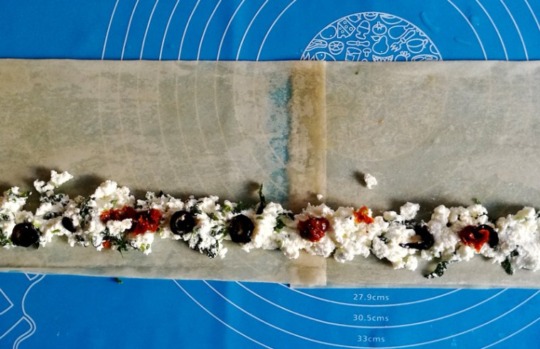 Половинки сложить вдоль, место склейки теста промазать маслом. В нижней части выложить творожную начинку, полосой в 3 см . На ней равномерно распределить колечки оливок и кусочки томатов. Свернуть тесто плотным рулоном, смазать поверхность маслом, а затем завернуть его улиткой.