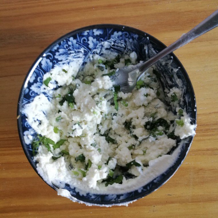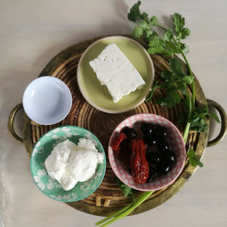 Мелко покрошить зелень кинзы, 1 чайную ложку зелени, которая понадобится для смазки готового изделия, отложить в отдельную мисочку и растереть с небольшим количеством масла. В другой мисочке раздавить вилкой фету, добавить в нее творог, остальную кинзу, все перемешать. Если в твороге много жидкости, его лучше предварительно отжать. Томаты вынуть из банки и дать маслу стечь. Нарезать колечками оливки, маленькими кусочками нарезать томаты. По желанию, можно класть в начинку только оливки или только томаты.