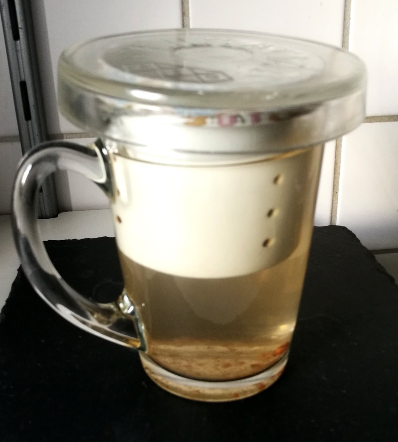 Засыпаю в чайное сито 2 полные чайные ложки гречки и заливаю ее кипятком. Чашку накрываю крышкой и настаиваю 5 минут.