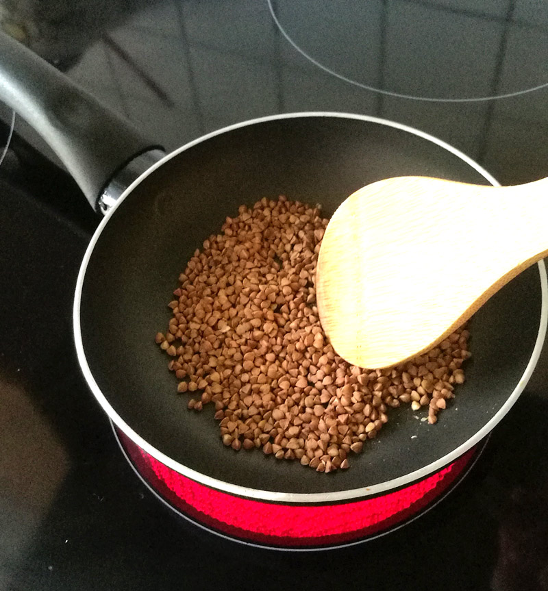 Подсушиваю гречку 10 минут, время от времени перемешивая. Гречка темнеет и зерна лопаются. Запах приятный, но такой интенсивный, что включаю вытяжку. В принципе, в обжарке гречки нет ничего нового. Так обжаривают зерна для рассыпчатой каши. Правда, для чая это нужно делать немного дольше.