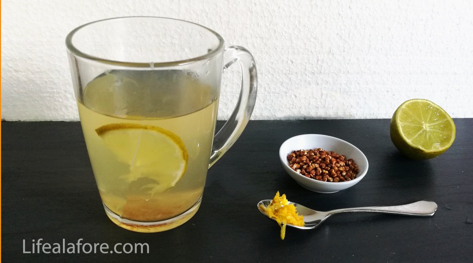 Не знаю, насколько этот напиток похож на японский, но пить приятно. Добавила еще для вкуса кусочек лайма. Кстати, в готовые гречневые чаи иногда добавляют цедру лимона или апельсина.