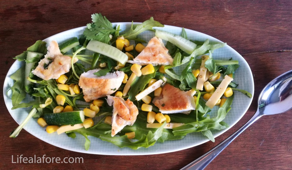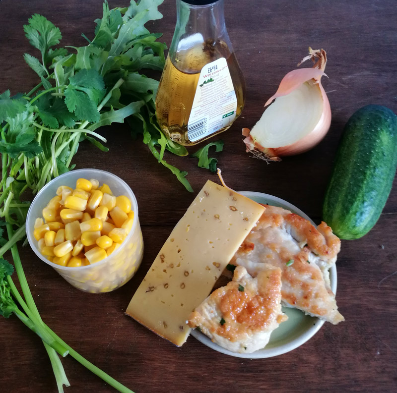 Чтобы приготовить такой салат потребуется 10 минут. Это просто классический рецепт для модного сейчас кулинарного тренда «Блюда их остатков». В нем можно заменить куриное филе на филе индейки или даже на кусочки рыбы. Все, что есть у вас вкусного, но мало осталось.