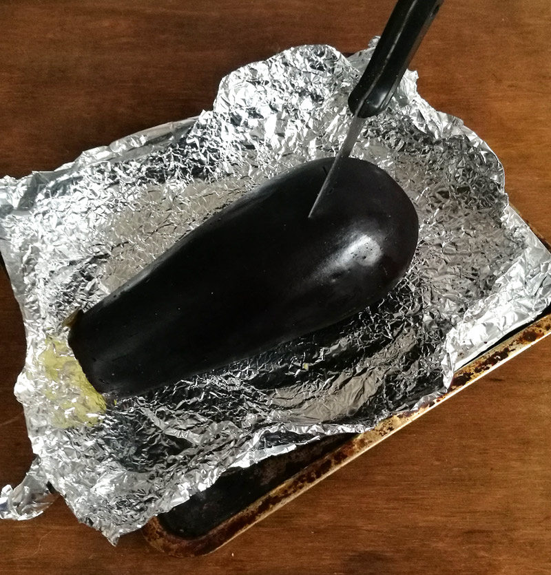 Разогреть духовку до 200°. Баклажан вымыть, обсушить и наколоть ножом со всех сторон.