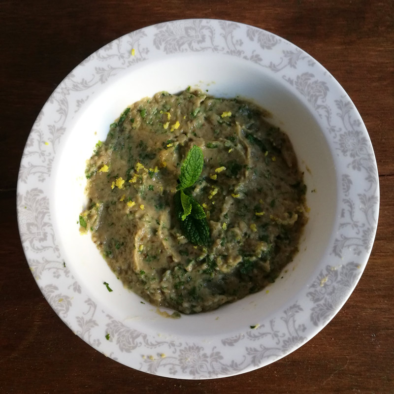Добавить мякоть баклажан, тахини, сок лимона, соль, кориандр. Все вместе быстро измельчить. Выложить в мисочку, полить оливковым маслом и посыпать цедрой лимона.