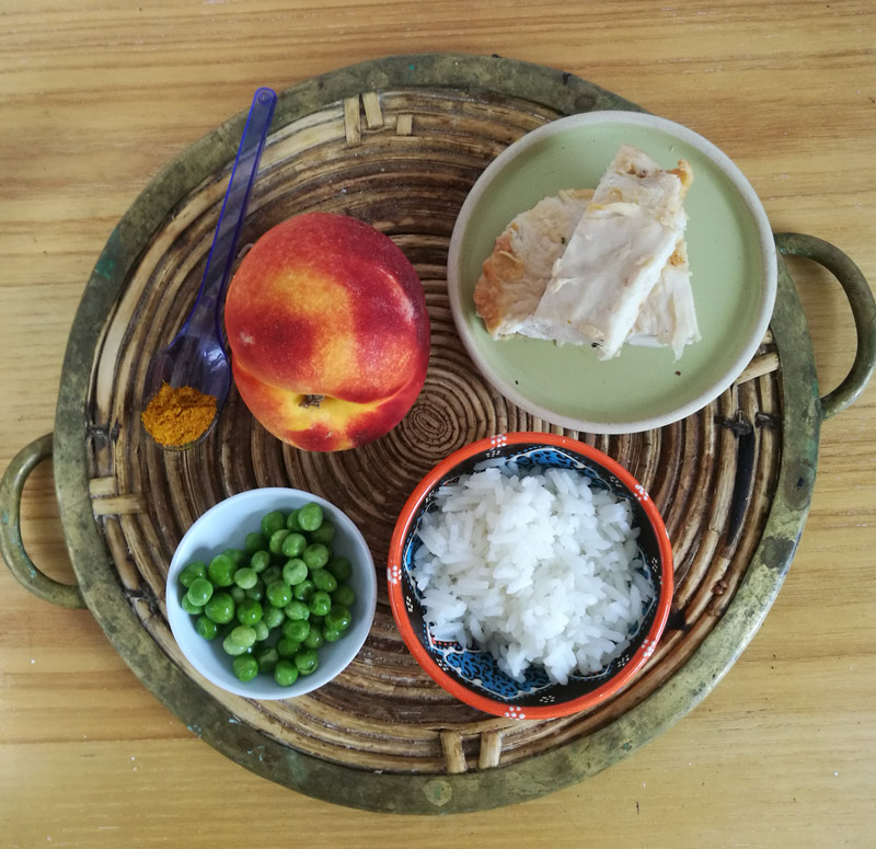 - Куриное филе (теплое или комнатной температуры) нарезать тонкими полосками. Рис с горошком выложить на тарелку. Сверху разложить кусочки филе и ломтики нектарина.