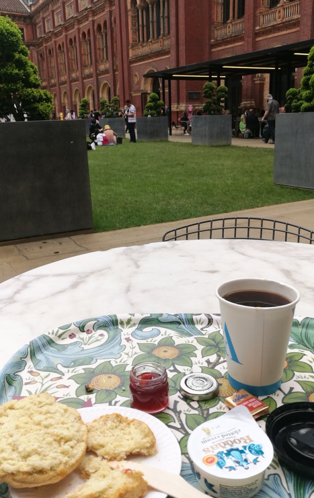Даже была в музеях. И вот тут, в музее Виктории и Альберта (музей декоративного икусства), я наконец, попробовала настоящий английский скон — большой кекс с изюмом. Я эти кексы иногда делаю дома, простое тесто совсем без сахара и небольшим количеством масла по рецепту от Джимми Оливера. Но я и не подозревала, что к нему обязательно подается баночка с джемом, баночка с кремом и еще, непонятно куда намазать, маленькая упоковочка сливочного масла.