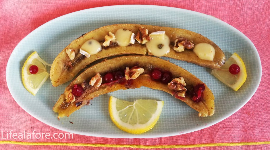 Готовые бананы переложить на блюдо, на половинки бананов без клюквы выложить кусочки сыра.