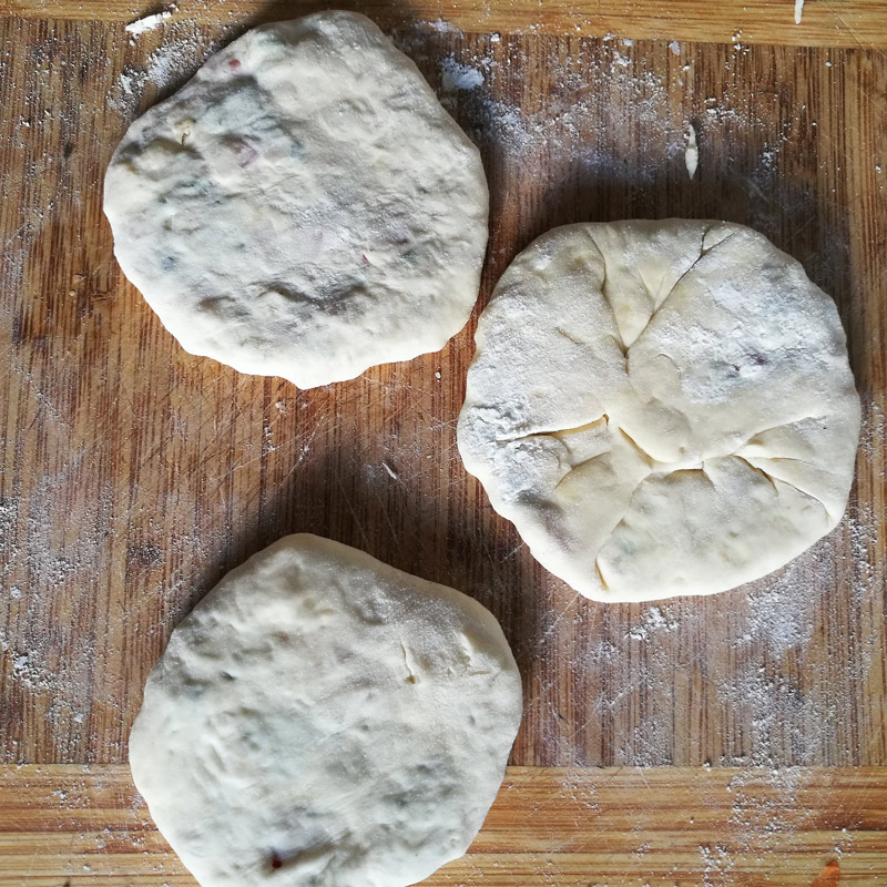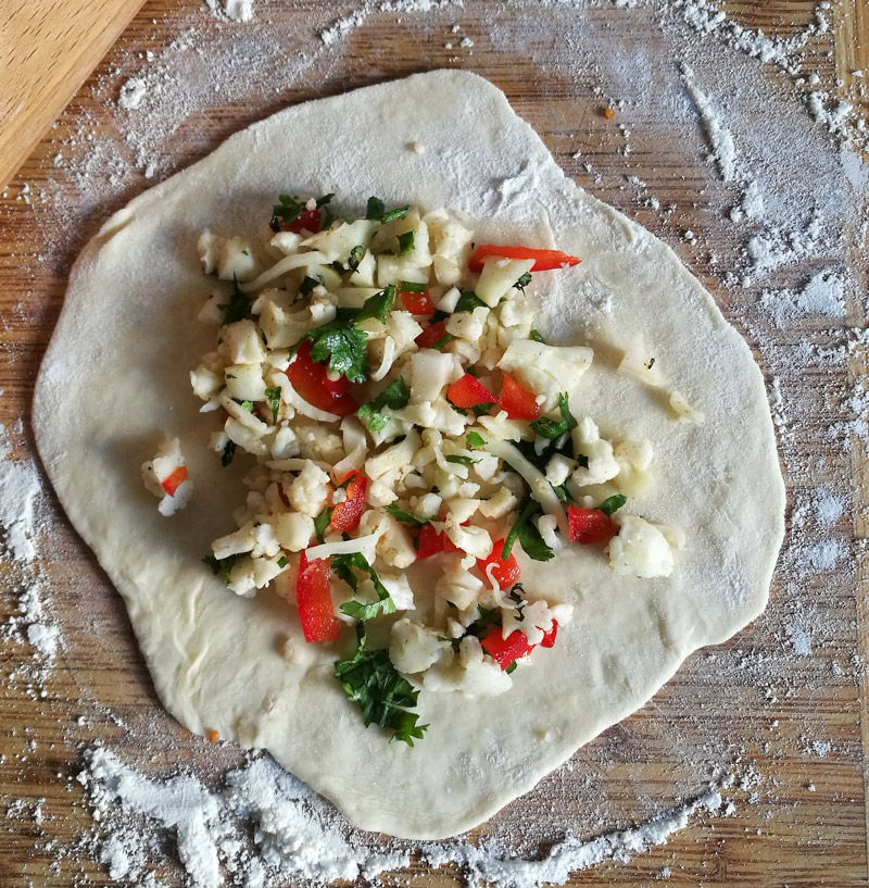 Тесто разделить на 4 одинаковых кусочка. Каждый кусочек раскатать в тонкий кружок диаметром около 15 см. На кружок выложить 1/4 часть начинки. Кружки залепить, повернуть залепленной частью вниз и осторожно прокатать лепешки скалкой. Сильно не надавливать, чтобы кусочки капусты не прорезали тесто.