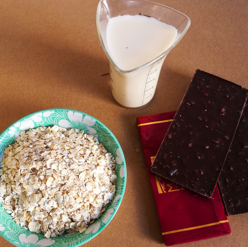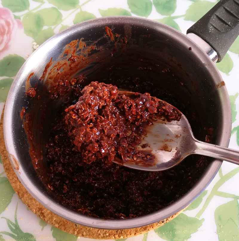 Кастрюльку с молоком поставить на плиту, положить в нее кусочки шоколада и нагреть на небольшом огне, пока шоколад не растопится. Все время мешать. Не кипятить. Когда масса станет однородной снять с плиты, добавить в нее хлопья, цедру и хорошо перемешать. Масса должна быть густой, но не сухой. При необходимости добавить в нее еще немного молока. (Количество молока зависит от того, какие хлопья вы использовали).