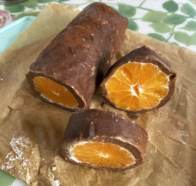 Мандарины очистить от шкурок. Тесто выложить на лист бумаги для выпечки, накрыть другим листом и раскатать. Верхний лист бумаги снять, края теста обравнять, обрезки вкатать в тесто и сформировать прямоугольный пласт. Ширина этого прямоугольника должна быть такой, чтобы тесто полностью обхватило мандарин, когда вы будете сворачивать рулет. Тот, кто помнит, что такое длина окружности в геометрии, легко посчитает, что ширина рулета должна быть в три раза больше диаметра мандарина.